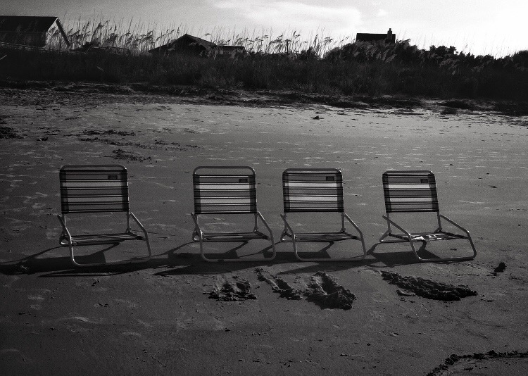 The chair on the left in the family of four beach chairs is placed slightly farther away than any of the others. Four identical chairs, still clearly with the family of four but separated slightly more than any of the others. Separated as if that chair could be on its own yet still close enough. Still identical to the other three, still together in the family of four but on its own too.